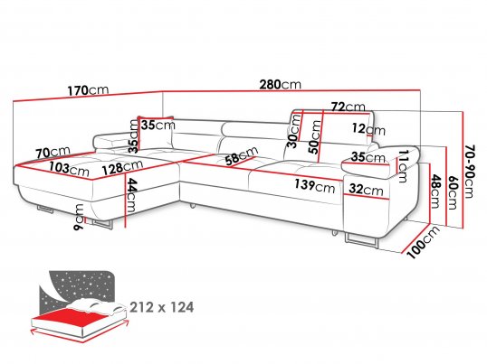 išmatavimai 170x280 cm. aukštis nuleistom /pakeltom/pagalvem 70/90 cm,